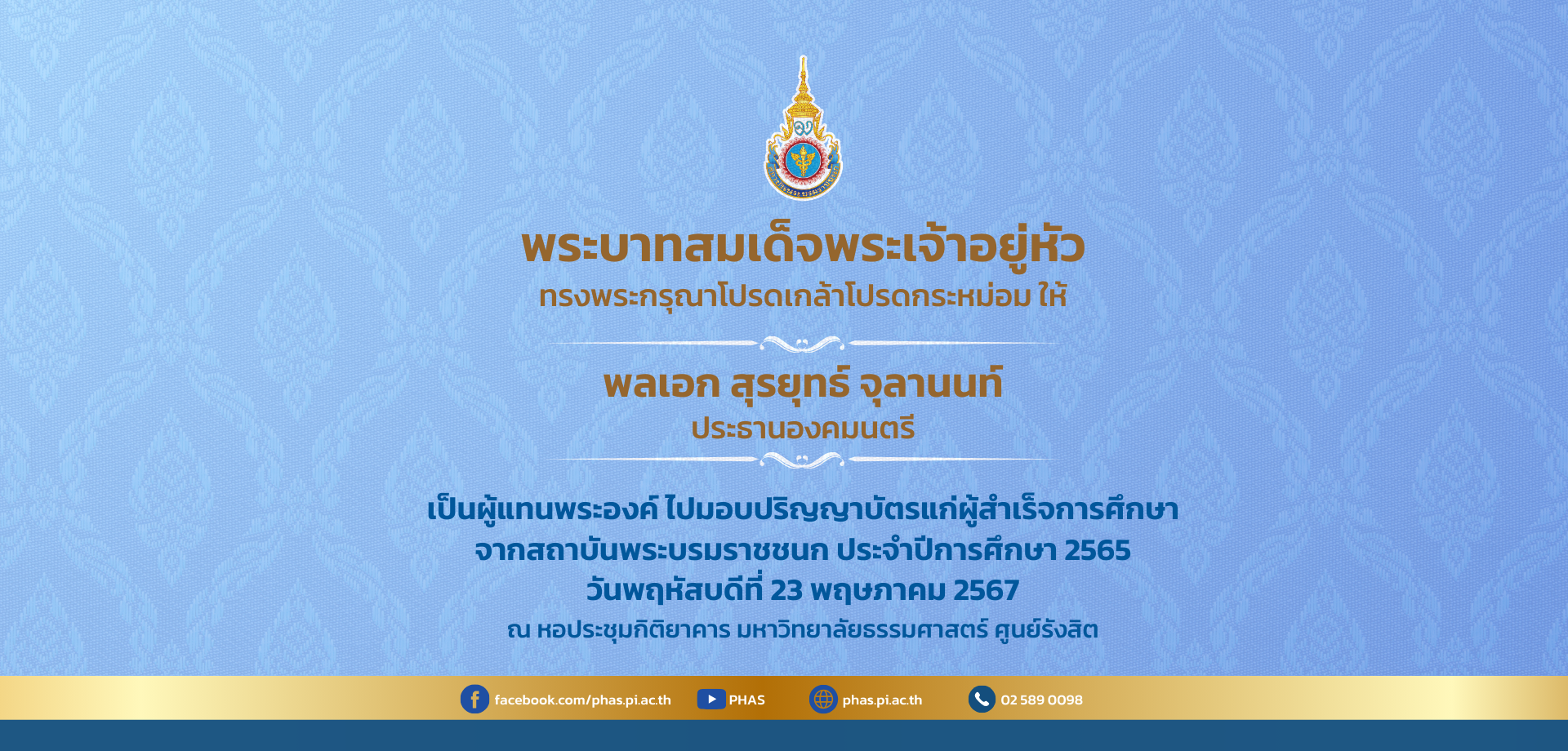 พิธีพระราชทานปริญญาบัตร สถาบันพระบรมราชชนก ประจำปีการศึกษา 2565 ในวันพฤหัสบดีที่ 23 พฤษภาคม 2567 ณ หอประชุม อาคารกิติยาคาร มหาวิทยาลัยธรรมศาสตร์ ศูนย์รังสิต อำเภอคลองหลวง จังหวัดปทุมธานี