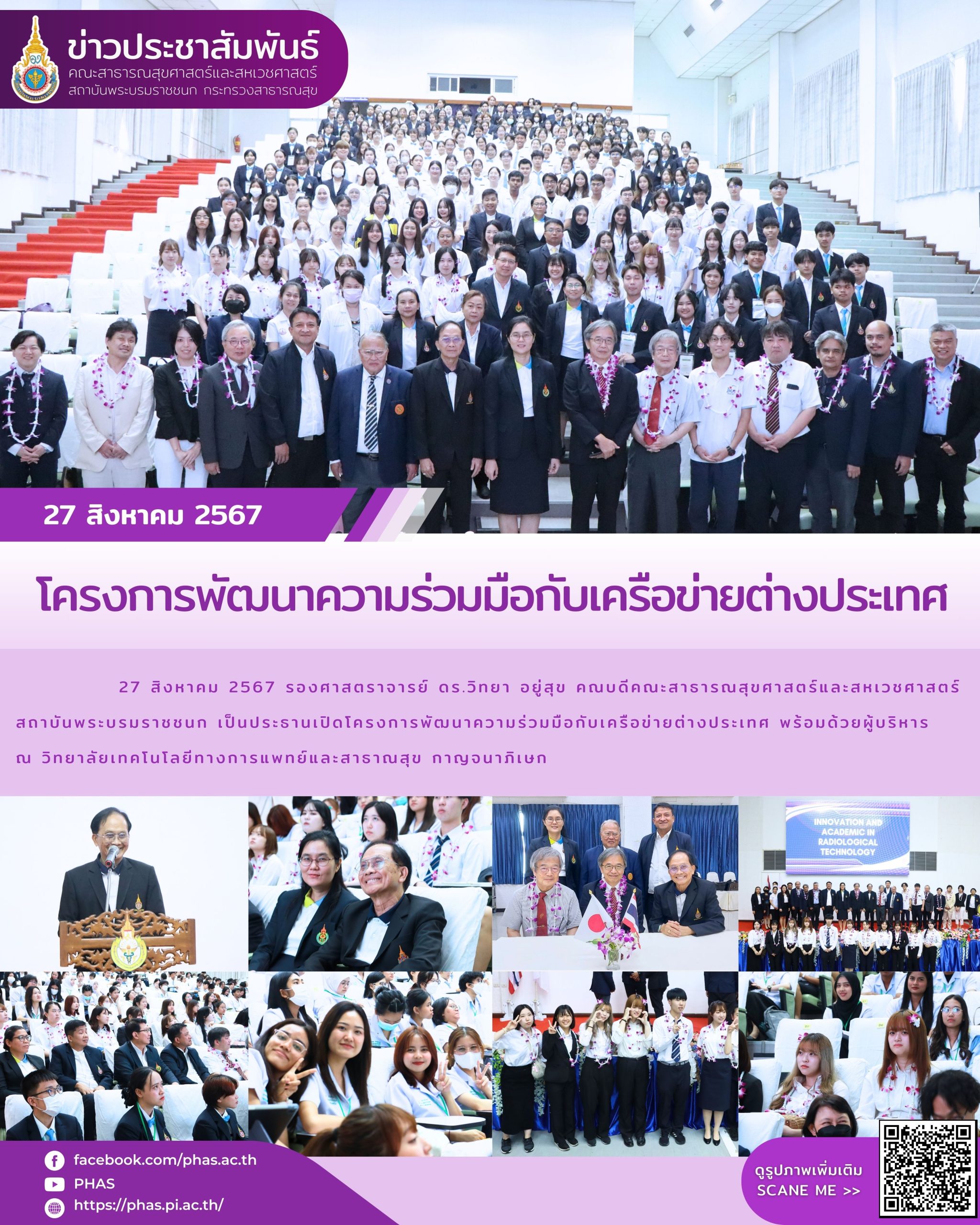 27 สิงหาคม 2567 วิทยาลัยเทคโนโลยีทางการแพทย์และสาธารณสุข กาญจนาภิเษก จัดโครงการพัฒนาความร่วมมือกับต่างประเทศ ประเทศญี่ปุ่น โดยมีอาจารย์และนักศึกษาจาก Komasawa University ร่วมแลกเปลี่ยนเรียนรู้ด้านการเรียนการสอนหลักสูตรรังสีเทคนิค และอภิปรายแนวทางการพัฒนาความร่วมมือทางด้านวิจัย การบริการวิชาการ และการแลกเปลี่ยนนักศึกษาในอนาคต