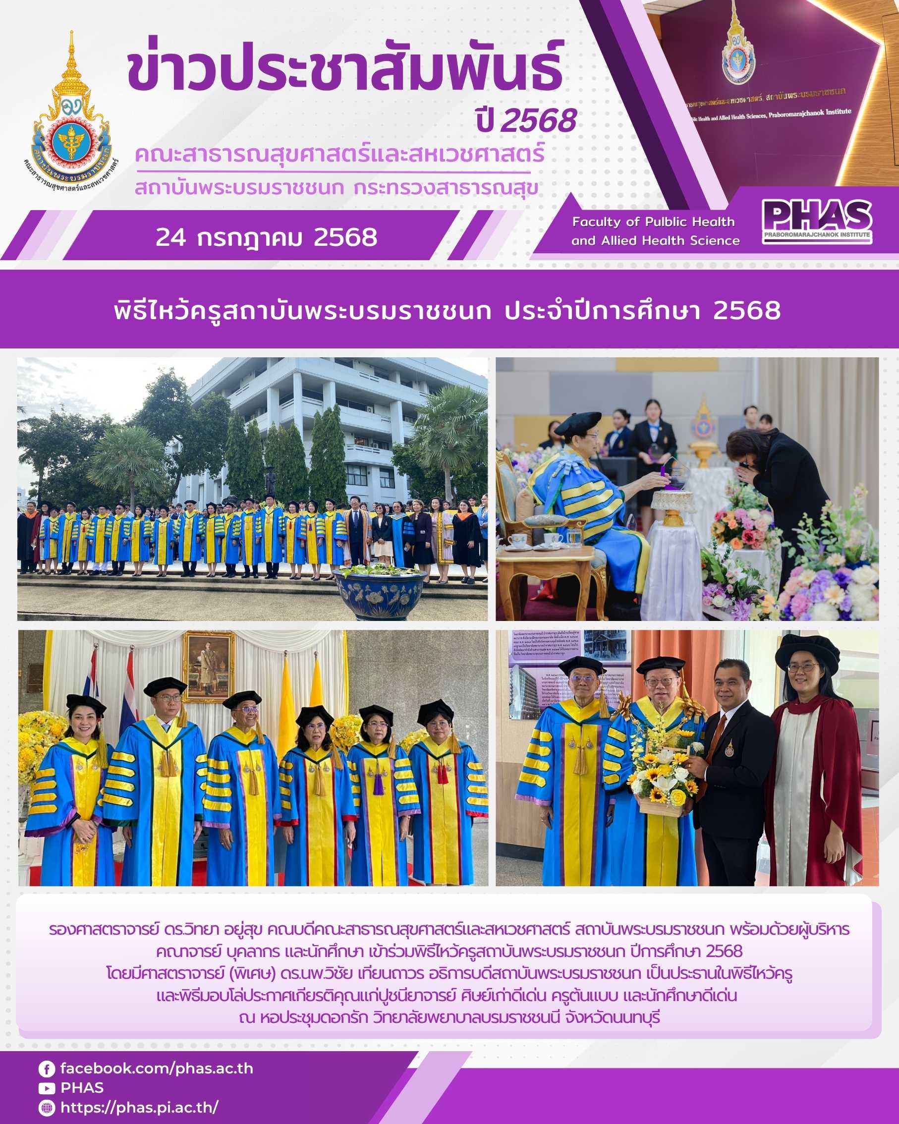 รองศาสตราจารย์ ดร.วิทยา อยู่สุข คณบดีคณะสาธารณสุขศาสตร์และสหเวชศาสตร์ สถาบันพระบรมราชชนก พร้อมด้วยผู้บริหาร คณาจารย์ บุคลากร และนักศึกษา เข้าร่วมพิธีไหว้ครูสถาบันพระบรมราชชนก ปีการศึกษา 2568