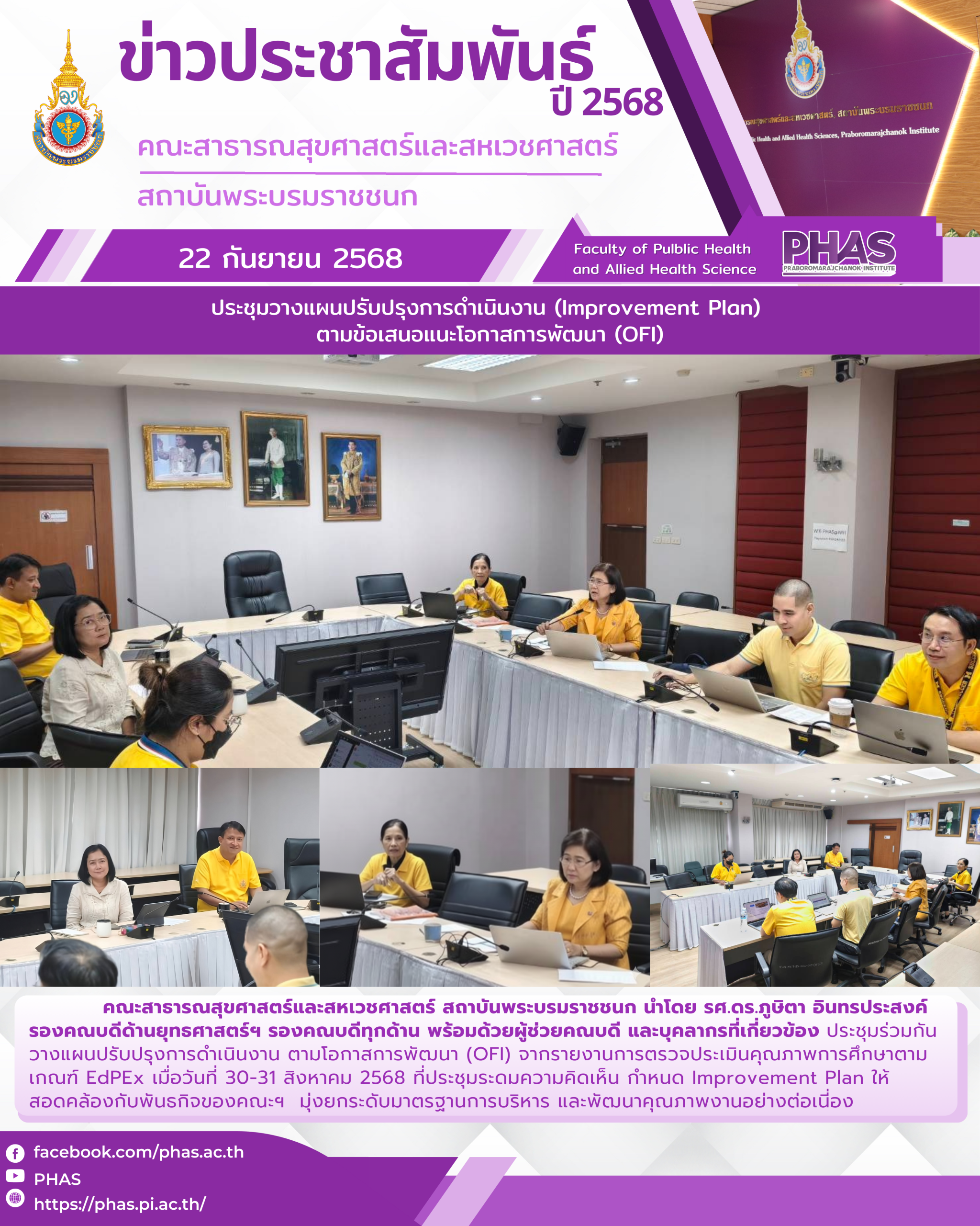 คณะสาธารณสุขศาสตร์และสหเวชศาสตร์ สถาบันพระบรมราชชนก นำโดย รศ.ดร.ภูษิตา อินทรประสงค์ รองคณบดีด้านยุทธศาสตร์ฯ รองคณบดีทุกด้าน พร้อมด้วยผู้ช่วยคณบดี และบุคลากรที่เกี่ยวข้อง ประชุมร่วมกันวางแผนปรับปรุงการดำเนินงาน ตามโอกาสการพัฒนา (OFI) จากรายงานการตรวจประเมินคุณภาพการศึกษาตามเกณฑ์ EdPEx เมื่อวันที่ 30-31 สิงหาคม 2568 ที่ประชุมระดมความคิดเห็น กำหนด Improvement Plan ให้สอดคล้องกับพันธกิจของคณะฯ มุ่งยกระดับมาตรฐานการบริหาร และพัฒนาคุณภาพงานอย่างต่อเนี่อง