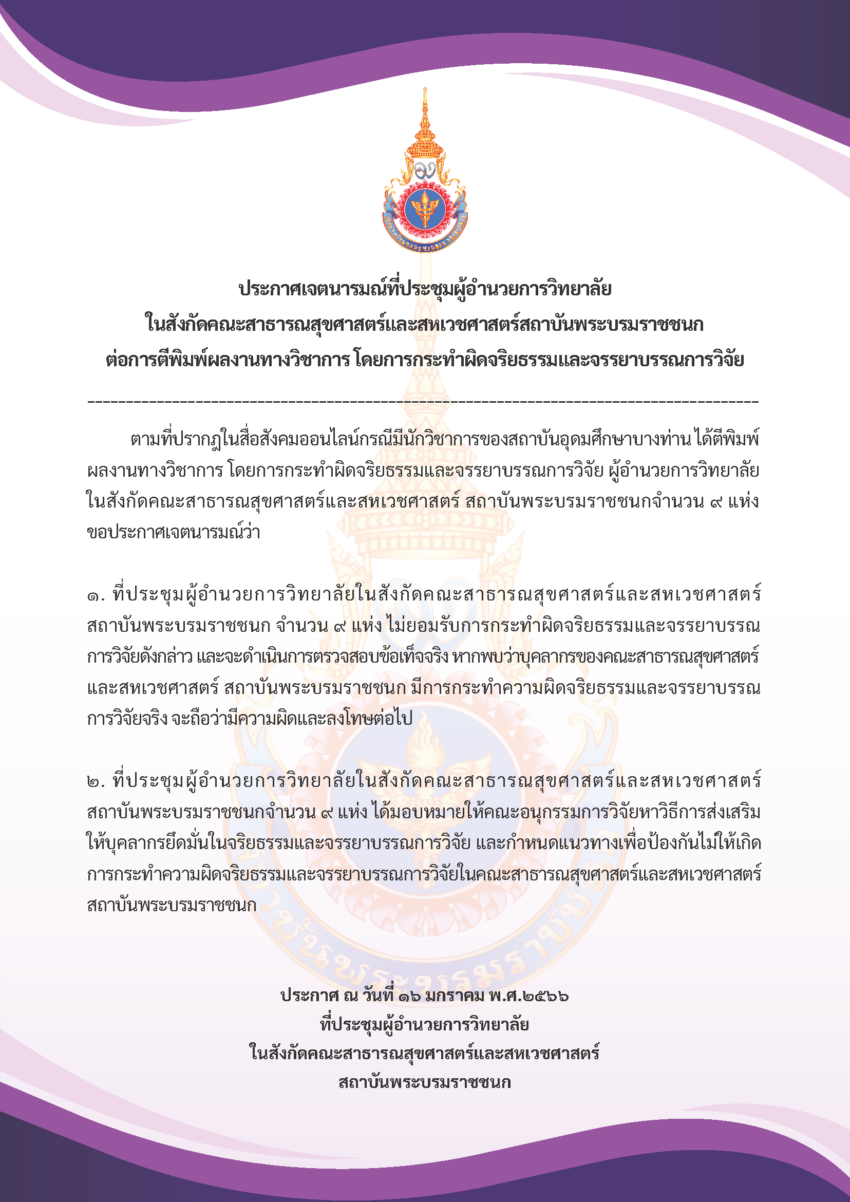 ประกาศเจตนารมณ์ที่ประชุมผู้อำนวยการวิทยาลัยในสังกัดคณะสาธารณสุขศาสตร์และสหเวชศาสตร์ สถาบันพระบรมราชชนก